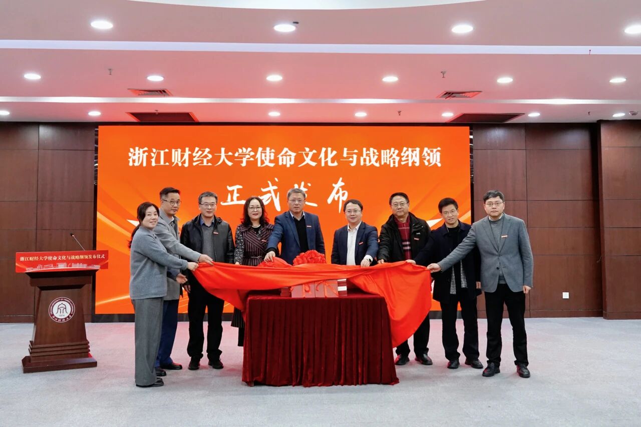 在全场热烈掌声中,魏江、陈衍泰、郑亚莉、李占荣、徐晓东、董进才、程爽、何贤杰、申屠莉共同为《浙江财经大学使命文化与战略纲领》揭幕。鲜红的绸缎缓缓落下,《纲领》文本在灯光下熠熠生辉,现场气氛达到高潮。这一刻,是历史的致敬,更是未来的开启;这一刻,浙财的精神血脉被再次唤醒,前行的方向更加清晰坚定。