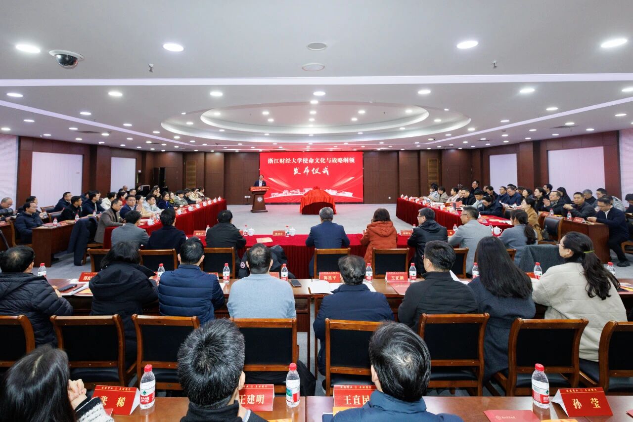 岁律更新,文脉无穷。1月29日,浙江财经大学学术中心多功能厅灯光璀璨、暖意融融,《浙江财经大学使命文化与战略纲领》(以下简称《纲领》)发布会隆重举行。魏江、陈衍泰、郑亚莉、李占荣、徐晓东、董进才、程爽、何贤杰、申屠莉等全体校领导班子成员,新华社、浙江日报、澎湃新闻、中国教育在线、杭州网等媒体记者到场见证,中层干部、师生代表、校友代表两百余人齐聚一堂,共同迎来这一载入校史的重要时刻。会议由校长、党委副书记陈衍泰主持。