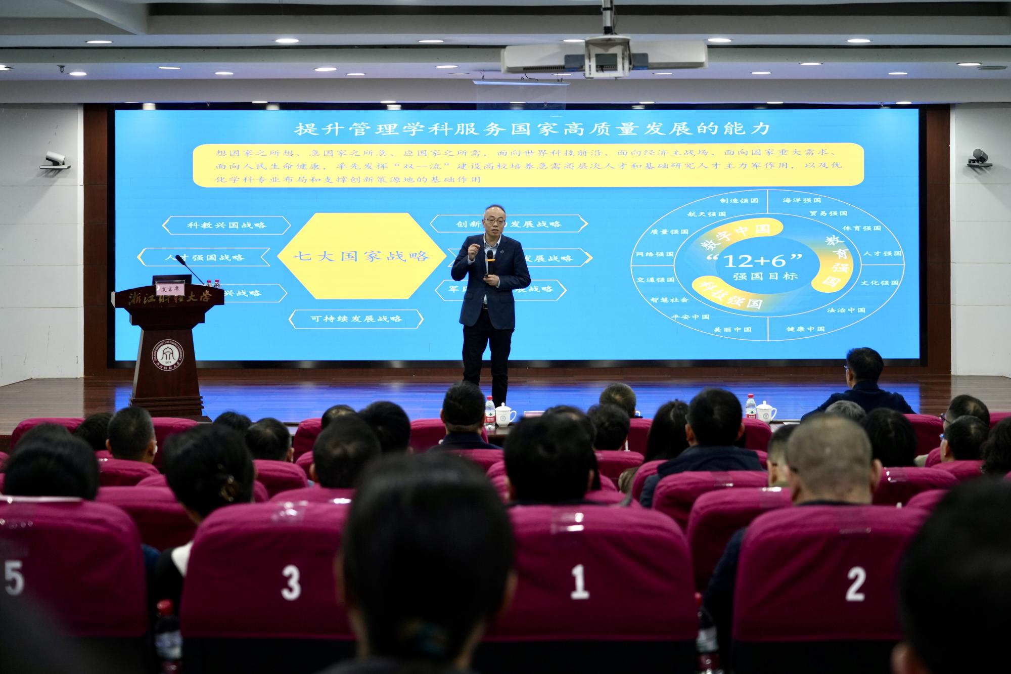 3月24日,学校举行中层干部专题学习会,校党委书记魏江出席会议并讲话,校党委副书记程爽主持会议,校党委委员、组织部部长申屠莉,全体中层干部、学术副院长、部门专聘副职等180余人参加会议。